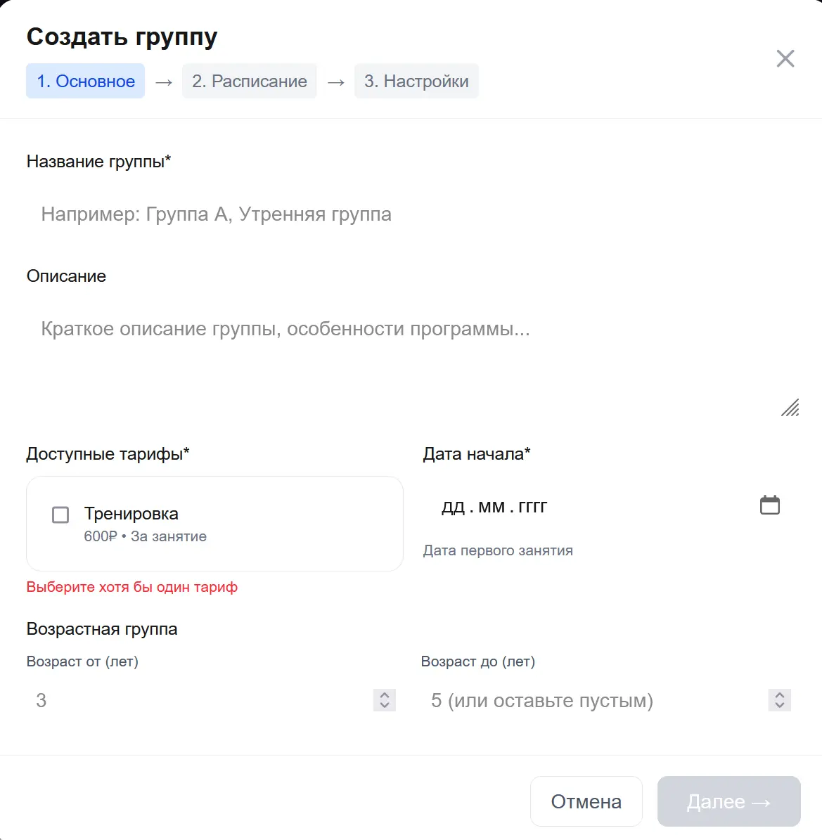 ℹ️ Важно правильно указать тарифы, созданные на странице «Моя страница». Именно по этим тарифам будут автоматически выставляться счета родителям.