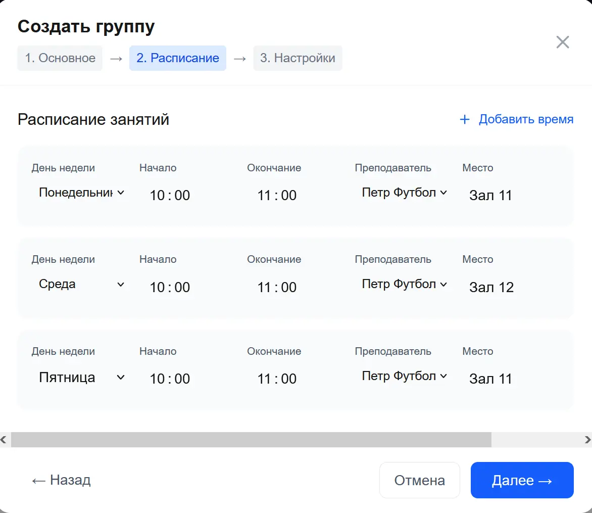 Укажите, в какие дни и в какое время проходят занятия. Для каждого слота можно задать: