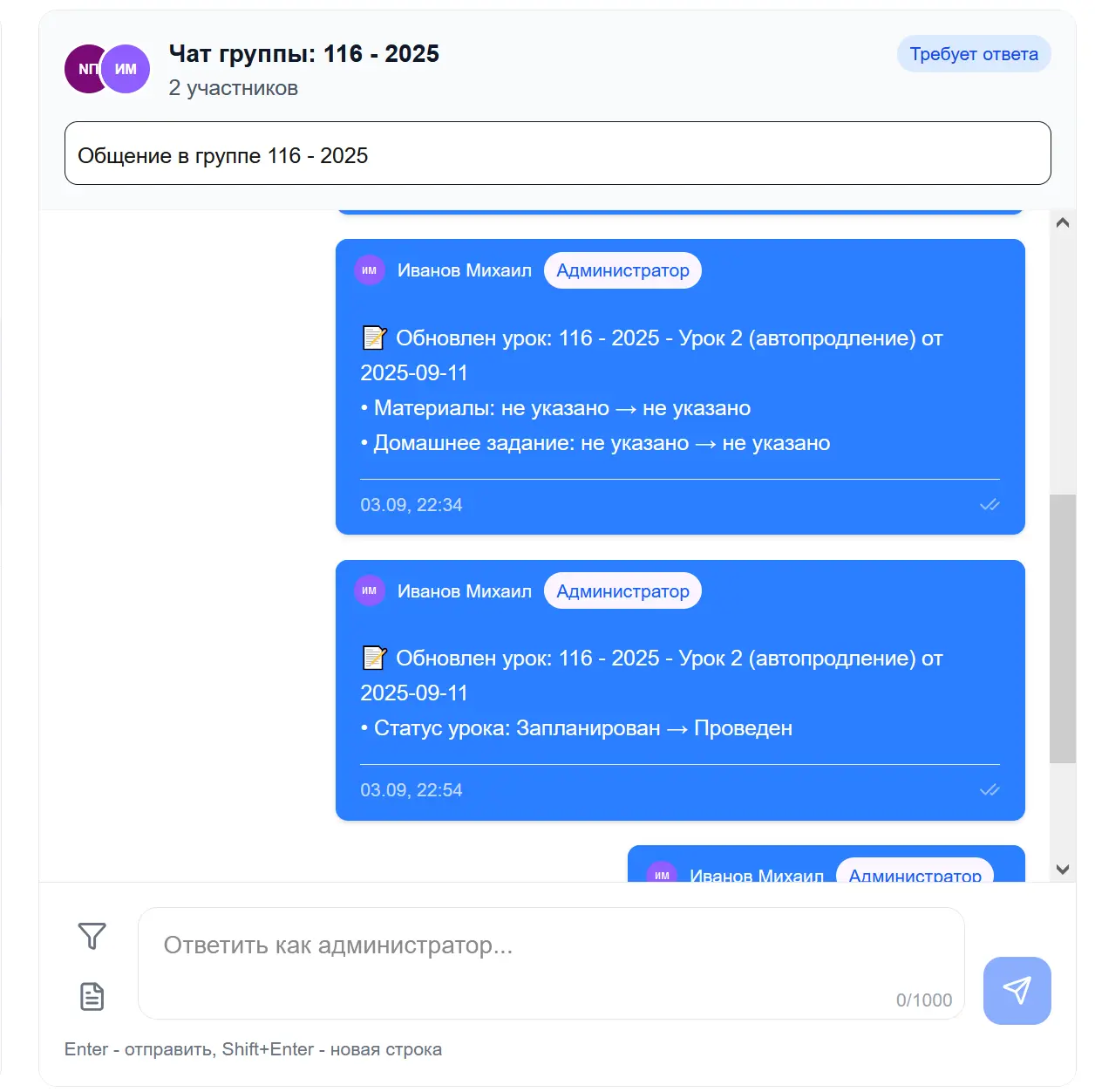 Для каждой группы создаётся отдельный чат. Туда автоматически добавляются родители, чьи дети будут зачислены в группу, и удаляются при исключении ребёнка. В этом чате могут общаться: