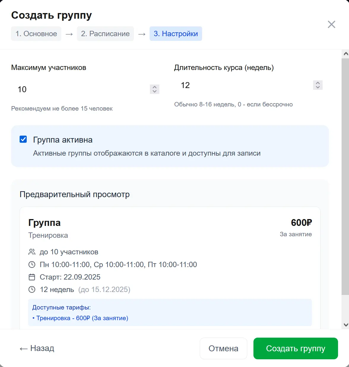 Работа на платформе начинается с создания группы. Группа объединяет учеников, имеет своё расписание и тарифы. Для создания группы: